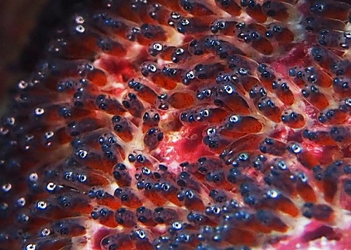 この個体がくわえている卵には、もう目玉が出来ていますよ!